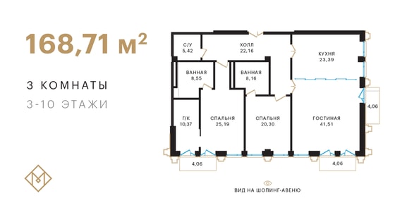 На первой линии резиденции премиум-класса Mirabad Avenue доступны апартаменты площадью 168,71 м² в блоках С и D со скидкой 10% при условии 100% оплаты.