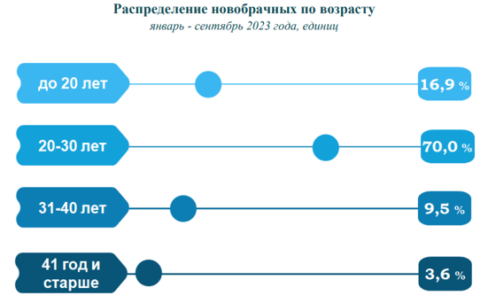 Средний возраст женщин, вступивших в брак, составил 22,5 года, а средний возраст мужчин — 27,3 лет. Наибольшая доля зарегистрированных браков приходится на женщин в возрасте до 25 лет — от 74,6% всех браков.