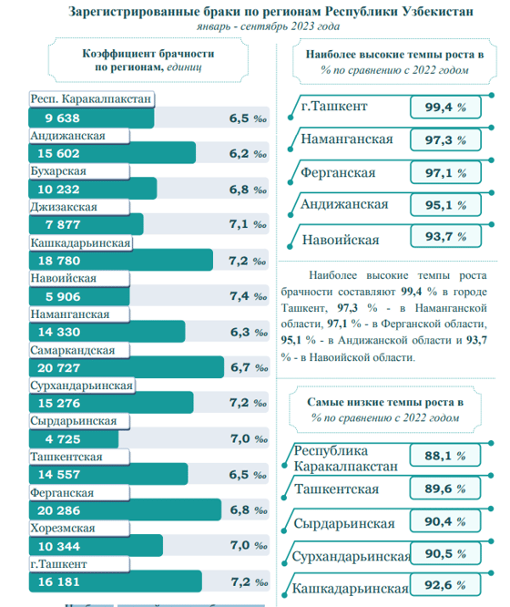 Наибольшее количество браков зарегистрировали в Самаркандской, Ферганской и Кашкадарьинской областях.