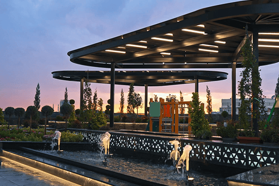 Еще одна особенность комплекса — футуристичный двор на высоте около 30 метров. Во дворе расположены: детские площадки, лаунж-зоны, фонтаны и озеленение.