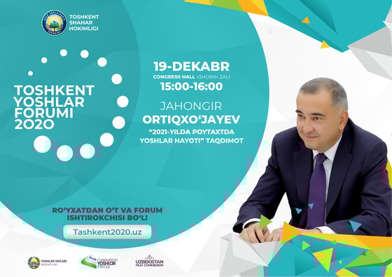 19 декабря хоким Ташкента Джахонгир Артыкходжаев выступит с презентацией «Жизнь молодежи в столице в 2021 году» в зале «Шош» Congress hall Ташкента. Встреча начнется в 16:00 и пройдет в рамках «Ташкентского молодежного форума — 2020».