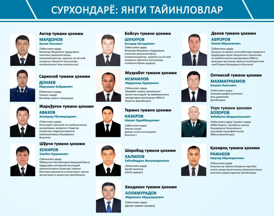 В 13 районах Сурхандарьинской области назначили новых хокимов. Об этом сообщили в Telegram-канале Davlat boshqaruvi.