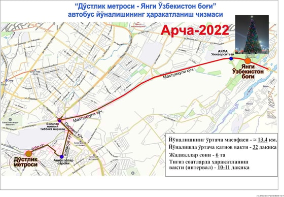 Согласно данным, маршрут начнет ездить с 20 декабря до 10 января. Плата за проезд взыматься не будет. Автобус будет курсировать с 08:00 до 22:00 от станции метро «Дустлик» и до парка «Новый Узбекистан».