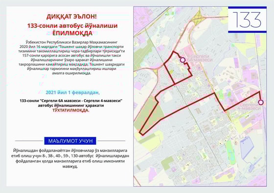 Согласно требованиям Постановления Кабмина Узбекистана №157 от 16 марта 2020 года «О мерах по улучшению пассажирской транспортной системы города Ташкент» для регулирования и оптимизации сети маршрутов, с 1 февраля 2021 года закрывается автобусный маршрут №133 «Массив Сергели 4 - Массив Сергели 6А», передает ведомство.