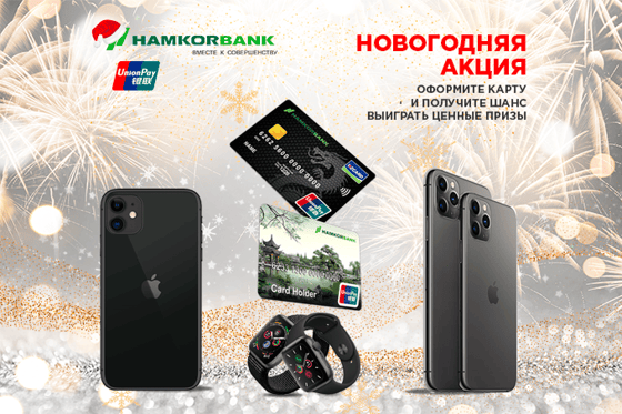 Новогодняя акция от Hamkorbank для держателей карт UnionPay. Просто совершайте покупки по картам UnionPay и станьте обладателем одного из следующих призов:
