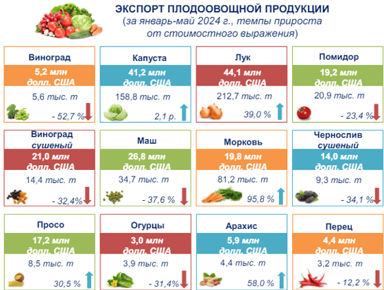 В январе-мае 2024 года Узбекистан экспортировал за рубеж 722,1 тысячи тонн фруктов и овощей на $420,1 млн. Об этом сообщает Агентство по статистике.