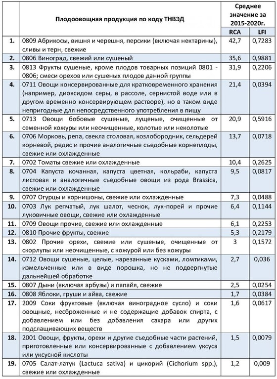 Согласно результатам расчетов, из 35 анализируемых групп товаров в 2015-2020 годах, Узбекистан обладал существенными сравнительными преимуществами только по 16 группам товаров. Взятые вместе, эти группы товаров представляли почти 40% общего экспорта узбекистанской плодоовощной продукции в 2019 году.