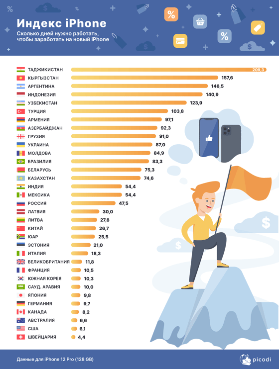 Учитывая среднестатистическую заработную плату в странах Закавказья и Средней Азии, заработать на новинку быстро не получится. По последним официальным данным средняя зарплата в Грузии составляет 1 239,5 ₾ (1 014,86 лари после вычета налогов). Получается, что среднестатистический грузин должен отработать 91 день, чтобы заработать на iPhone 12 Pro (и при этом ничего не есть). В Азербайджане ситуация выглядит следующим образом: зарплата в 636,6 ₼ (с вычетом налогов) позволит купить последнюю новинку от Apple за 92,3 дня. Еще дольше работать придётся в Армении — 97,1 дня при средней «чистой» зарплате 141 396,71 ֏. В Узбекистане и Кыргызстане iPhone 12 Pro «стоит» больше ста трудодней: 123,9 и 157,6 дня соответственно. Жители Таджикистана будут работать на новый iPhone гораздо дольше своих соседей: им потребуется 209,3 рабочих дня.