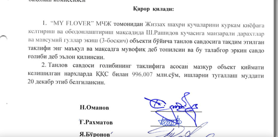 В феврале 2020 года ООО My Flower в качестве подрядчика стало победителем конкурса по посадке сезонных цветов на улицах Джизака.