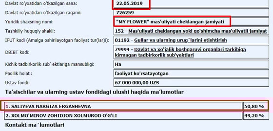 Блогер Davletov в своем Telegram-канале отметил, что 50,80% акций данного субъекта предпринимательства, зарегистрированного в мае 2019 года, принадлежит Салиевой Наргизе Эргашевне, а 49,20% - Холмуминову Зохиджону Холмуродовичу. Предприятие занимается выращиванием цветов и семенами.