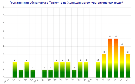 Послезавтра (30 ноября) в Ташкенте ожидается магнитная буря мощностью пять баллов, следует из данных сервиса Meteonova.