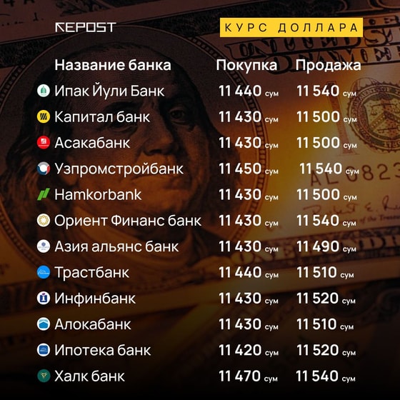 Коммерческих банки Узбекистана понизили курс доллара к суму. Большинство банков предлагают купить доллар за 11 440 сумов, а продать за 11 540 сумов.