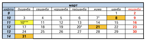 - 10 марта, понедельник — дополнительный выходной, так как 8 марта выпало на субботу.