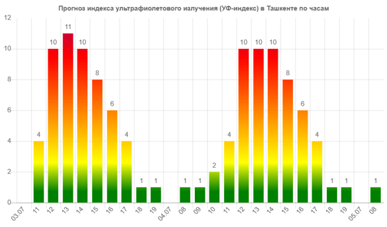 Сегодня (3 июля) в Ташкенте ожидается экстремальный 11-балльный уровень ультрафиолетового излучения, следует из данных сервиса Meteonova.