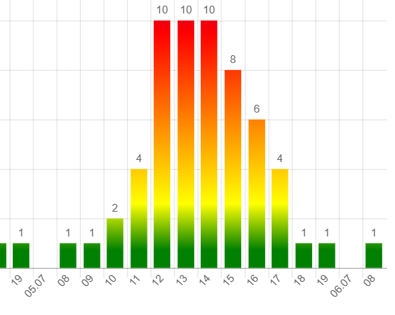 Согласно прогнозу, 10-балльный показатель будет наблюдаться в 12:00-14:00. После этого уровень начнет постепенно снижаться.