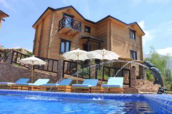 Коттеджи класса "люкс" построены из срубов сосны. Каждый номер гостевого дома выполнен в авторском стиле, а интерьер дополняют эксклюзивная мебель, коврики ручной работы и постельное белье из натурального хлопка. Чарующий вид из окна на горы Чимгана не оставит вас равнодушными.