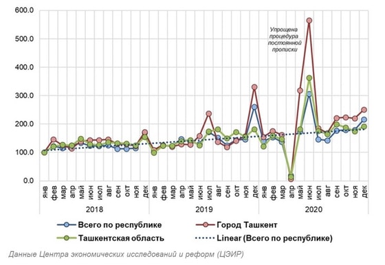 Также не следует воспринимать буквально данные статистики о величине сальдо миграции по Ташкенту: разница между количеством прибывших и выбывших из столицы. За 2020 год положительное сальдо миграции достигло в столице 71,8 тысячи человек (в январе-сентябре 2020 года этот показатель составлял 59,7 тысячи), что значительно превышает этот показатель за 2019 год (положительное сальдо миграции тогда составило всего 27,0 тысяч человек). Значительная часть «прибывших» – это граждане, переоформившие на своё имя жилье и получившие регистрацию для себя и членов своих семей по месту постоянного проживания в городе Ташкенте (пункт 1 Перечня категорий лиц, утверждённого законом от 14 сентября 2011 года № ЗРУ-296).