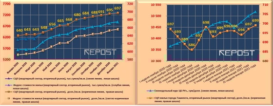 Индекс стоимости жилья (средняя цена предложения, скорректированная на усреднённый размер дисконта или скидки при совершении сделок между продавцами и покупателями квартир) в январе 2021 года по сравнению с уровнем предыдущего месяца вырос в долларовом выражении на 0,5% до значения 656 долларов/кв. м, а в сумовом, соответственно, на 0,9% и 6 891,3 тысячи сумов/кв. м.