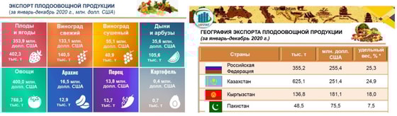 За 2020 год доля плодоовощной продукции в общем объёме экспорта составила 6,7%.