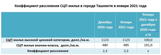 Если следовать американскому методу, то средняя стоимость найма квартиры в Ташкенте в январе 2021 года должна была составлять 5,92 доллара/кв. м, что значительно выше фактически сложившегося показателя (5,6 доллара/кв. м).