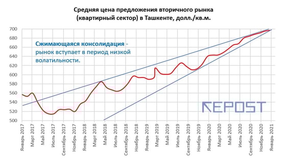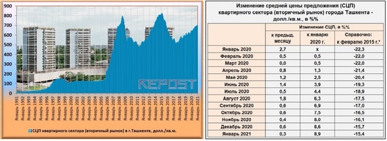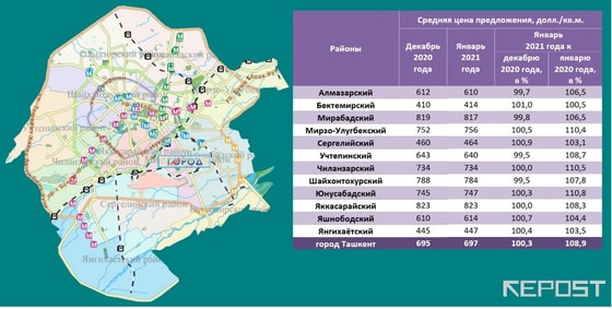 В январе 2021 года средняя цена предложения (СЦП) жилой недвижимости (квартирный сектор, вторичный рынок) города Ташкента составила 697 долларов/кв. м. Это на 0,3% выше уровня аналогичного показателя предыдущего месяца (в декабре 2020 года прирост составил 0,6%).