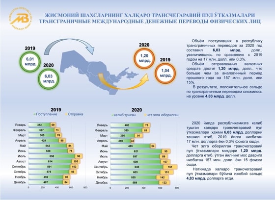 «Отсутствие резкого сокращения денежных переводов объясняется тем, что в период до пандемии определенная часть денежных переводов поступала неформально (наличными), в обход банковской системы. С момента введения карантинных ограничений и невозможности перемещения между странами, ранее не учитываемая часть денежных переводов стала проходить через банковскую систему», – указали в Центральном банке Узбекистана.
