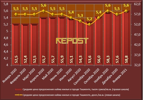 - Средняя стоимость найма квартир в январе 2021 года в Ташкенте повысилась на 1,8% (до уровня 5,6 доллара/кв. м). В национальной валюте стоимость найма квартир также увеличилась по сравнению с декабрём 2020 года на 2,2% и составила 58,8 тысячи сумов/кв. м.