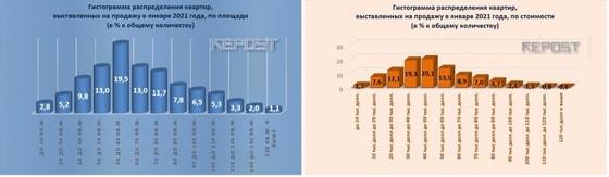 Более 57% квартир, выставленных на продажу в январе 2021 года, имели общую площадь от 40 до 79 квадратных метров. Это средняя площадь типовых двух- и трёхкомнатных квартир. Именно этот сегмент занимает почти 52% квартирного рынка с ценами продаж 20-49 тысяч долларов: 12,1% занимают квартиры с ценами предложения от 20 до 30 тысяч долларов; 19,3% - с ценами предложения 30-39 тысяч долларов и 20,1% - от 40 до 50 тысяч долларов.