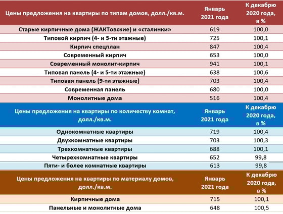 В январе 2021 года цены на квартиры, расположенные в старых кирпичных домах, остались без изменений (619 долларов/кв. м). В 4-х и 5-ти этажных кирпичных домах типовой планировки СЦП увеличилась за январь 2021 года на 0,1% (725 долларов/кв. м). В 4-х и 5-ти этажных панельных домах типовой планировки СЦП наблюдался более заметный рост цен предложения (на 0,6% - до 638 долларов/кв. м). В панельных девятиэтажных домах типовой планировки средняя цена предложения за январь 2021 года повысилась на 0,4% - до 703 долларов/кв. м.
