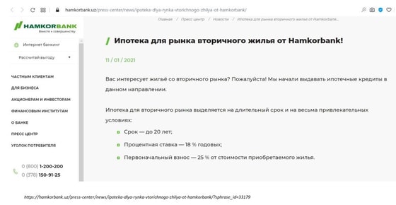 11 января 2021 года появилась информация об открытии кредитной линии для приобретения жилья на вторичном рынке ещё от одного банка – Hamkorbank.