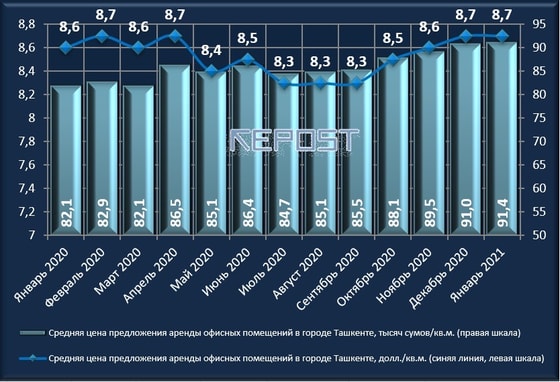 В январе 2021 года средняя цена предложения аренды офисных помещений осталась на уровне декабря 2020 года - 8,7 доллара/кв. м. В национальной валюте стоимость аренды достигла 91,4 тысячи сумов/кв. м, увеличившись за месяц на 0,4%. По сравнению с январём 2020 года года средний размер аренды офисов вырос в долларовом выражении на 1,2%, а в сумовом – на 11,3%.