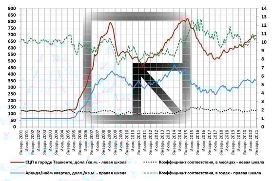 На графике представлены коэффициенты соответствия величин найма и стоимости жилья. Это время (месяцы или годы), необходимое для того, чтобы сумма платы за наём жилья сравнялась с рыночной стоимостью квартиры. В январе 2021 года этот показатель в среднем по Ташкенту составил 124 месяца (по сравнению с предыдущим месяцем показатель сократился на 2 месяца) или 10 лет и 4 месяца.