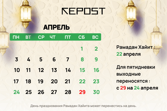 Рамадан Хайит выпадает на 22 апреля. Точная дата будет известна после подписания соответствующего указа.