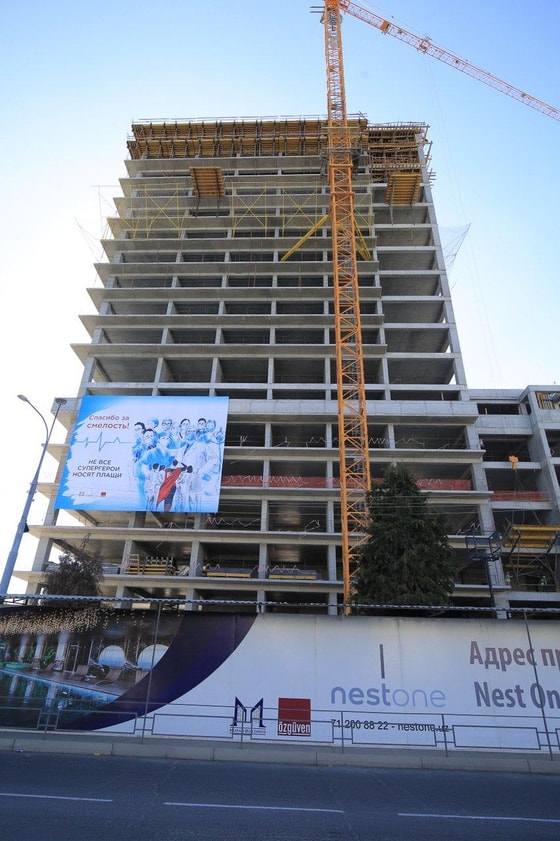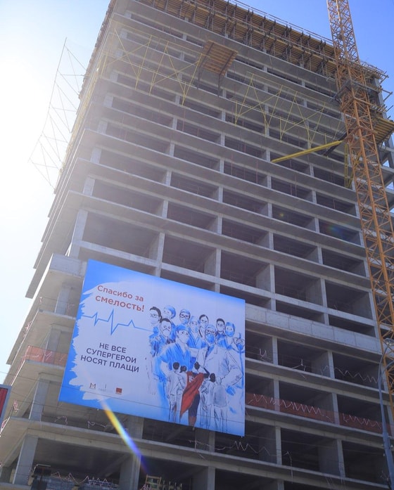 «Не все супергерои носят плащи» — на одном из зданий Nest One был размещён баннер, в поддержку врачей, которые борются с пандемией короновируса.