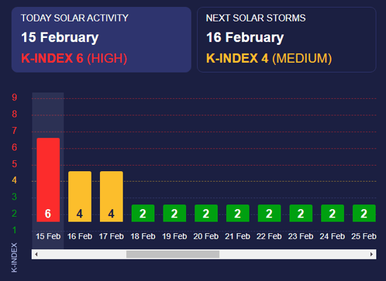 Завтра и послезавтра (16-17 февраля) будет наблюдаться «желтая» магнитная буря, после этого показатель опустится до минимальных значений.