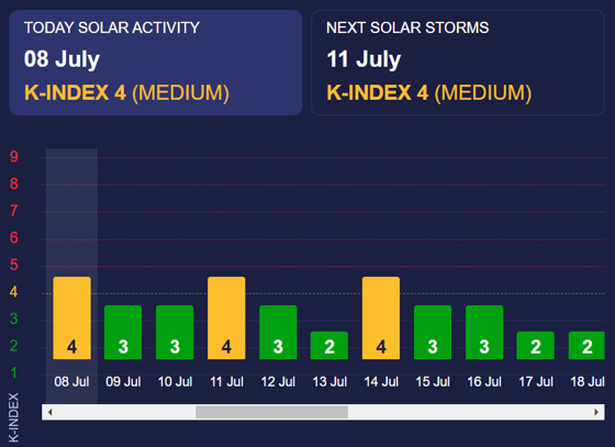 Завтра показатель должен опуститься до низкого уровня. В четверг (11 июля) снова ожидается К-индекс 4.