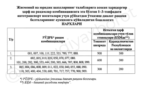 - 1-я категория (001, 007, 111, 222, 555, 700, 777, 888) – 900 БРВ в Ташкенте, а в областях и Каракалпакстане – 500 БРВ;