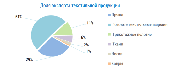 В структуре экспорта текстильной продукции основную долю занимают готовые текстильные изделия (50,8%) и пряжа (29%).