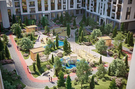 Территория NRG JOMIY следует концепции «зеленый двор без машин», где предусмотрены игровые детские площадки, воркаут-зона, беседки и авторский ландшафтный дизайн. Дизайнерские холлы при входе в подъезды будут радовать не только жильцов но и их гостей. Для мам с младенцами в холлах будут колясочные места для хранения детских колясок. В каждом сквозном подъезде имеется по 2 лифта — пассажирский и грузовой, которые будут курсировать от подземной парковки до последнего этажа. Лифты можно будет вызвать специальной сенсорной кнопкой, которая будет срабатывать также и при касании ногой. У автовладельцев будет возможность хранить авто на подземной парковке, со специально отведенными местами для мотоциклов и велосипедов, с доступом в те же лифты. А на территории комплекса будут предусмотрены зарядки для электрокаров. Кладовые помещения в нижних этажах позволят хранить вещи, которые используются редко и не будут загромождать квартирное пространство. Теперь любимый сноуборд, санки, детская коляска или сезонная одежда и обувь будут в тепле и сохранности. В комплексе предусмотрена комната просвещения, предназначенная для уединения с собой, своими мыслями и мечтами. Утренняя и вечерняя молитва вместе с соседями — это безграничное счастье для тех, кто соблюдает религиозные обряды.