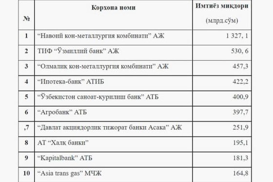 Агентство по противодействию коррупции опубликовало список хозяйствующих субъектов Узбекистана, имеющих наибольшее количество налоговых льгот, а также сумму предоставляемых им льгот.