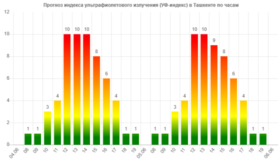 Десятибалльный показатель будет наблюдаться в 12:00-14:00. Снижение ожидается после 15:00. Аналогичные показатели ожидаются и 5 июня.