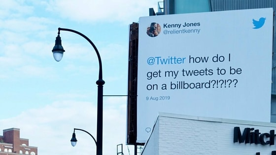 Студент университета Антанты Кенни Джонс рассказал в своём твиттере, что его публикацию с вопросом о том, как попасть с твитом на билборд, поместили на рекламный щит.
