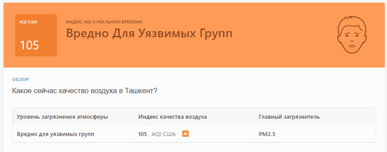 Так, в 08:45 станция мониторинга в столице Узбекистана показывала результат в 105 AQI. Концентрация PM2.5 — в 7,4 раза выше рекомендуемого ВОЗ среднегодового значения качества воздуха.