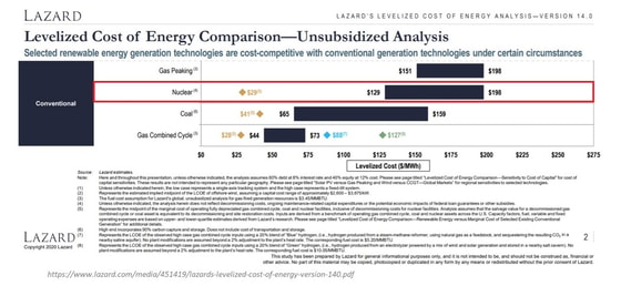 Согласно исследованию, проведённому Lazard, в последние 10 лет стоимость производства электроэнергии на АЭС - в отличие от стоимости производства иных видов электроэнергии – возрастала. Если в 2009 году средняя стоимость электричества, выработанного на АЭС составляла 12,3 цента/киловатт-час; в 2010 году - 10,7; в 2011 году - 9,5, то с 2012 года наблюдается рост до уровня 16,3 цента/киловатт-час в 2020 году.