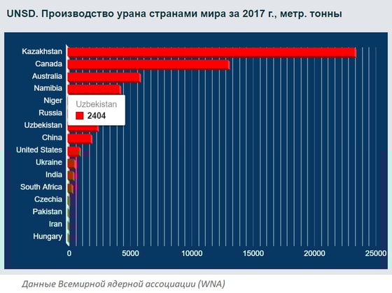 По данным Всемирной ядерной ассоциации, годовой объем производства урана в нашей стране превышает 2 400 метрических тонн. Узбекистан занимает седьмое место в мире по производству урана: объем производства урана в 2017 году составил в Узбекистане 2 404 метрические тонны.