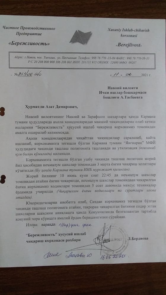 Согласно документу, частное производственное предприятие «Бережливость» занимается вывозом бытовых отходов из жилых домов на территории Навои, Зарафшана и Карманинского района Навоийской области. Отходы, вывозимые из домов населения, сортируются, перерабатываются, выбрасываются и утилизируются в мусорный полигон , принадлежащий предприятию на территории МСГ «Янгиарик» Карманинского района на расстоянии 220 км при помощи перегрузочной станции.