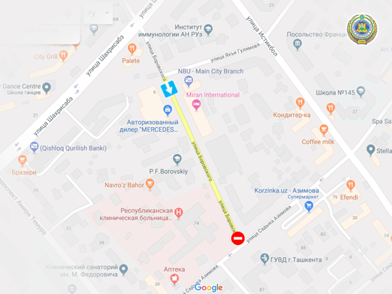 В целях безопасности направление движения на данном участке дороги временно сделано односторонним: она остается открытой для движения со стороны улицы Шахрисабз в сторону улицы Садика Азимова. С встречной стороны заезд на данный участок дороги был закрыт дорожным знаком 3.1 «Въезд запрещен». Также по улице Садика Азимова рядом с поворотом на улицу Боровского установлен предписывающий знак 4.1.1 «Движение только прямо».