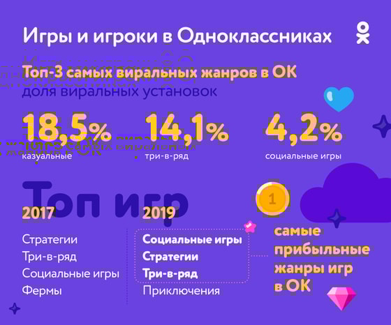 Одноклассники также проанализировали самые популярные жанры на игровой платформе. В ОК, где пользователи традиционно активно делятся эмоциями с родными и близкими, социальные механики игр (репосты, приглашения, соревновательность) делают их особенно успешными.