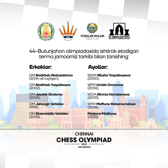 Ранее председатель федерации шахмат Узбекистана Алишер Саъдуллаев опубликовал список 10 молодых шахматистов из Узбекистана, которые примут участие в Олимпиаде.