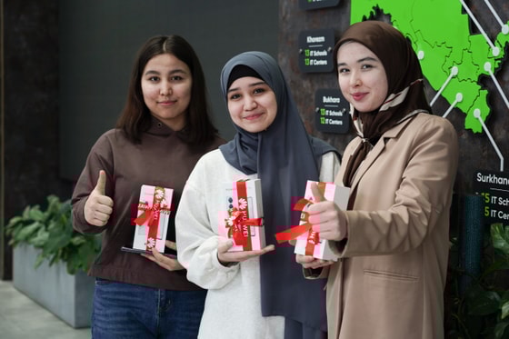 Участники Шохиста Рахимова, Дильноза Холисова и Муборакхон Тойчиев награждены смартфонами от Huawei.